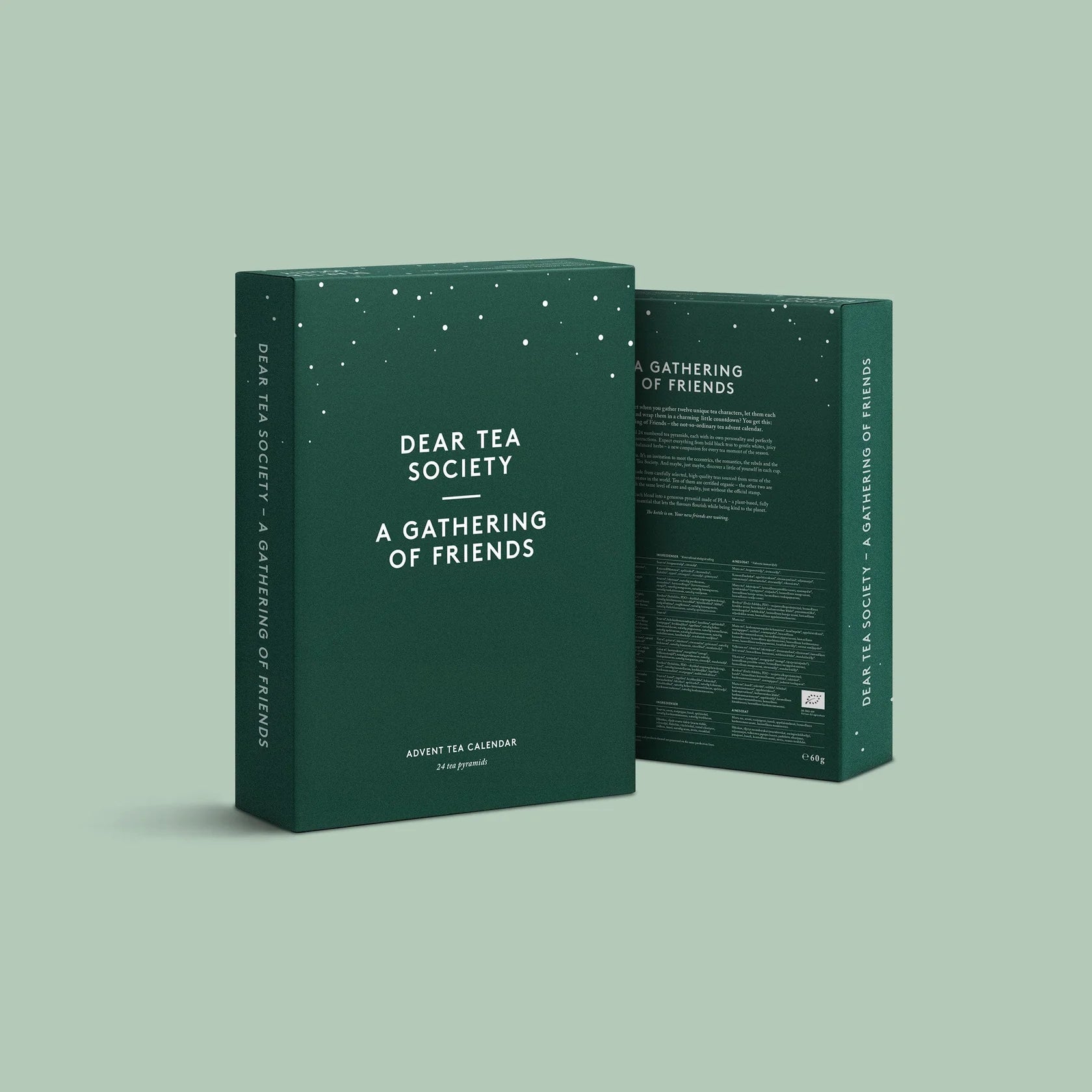 Mitä saat? A Gathering of Friends -setti on lähtölaskenta jouluun tai elämyspaketti lahjaksi teen ystävälle. Sisältä löydät ripustettavan, 24 numeroidun teepyramidin "teetaulun", jonka jokaisella kahdellatoista teellä on oma persoonansa ja valmistusohjeensa. Löydät kaikkea mustista teelaaduista lempeisiin valkoisiin, rooiboksiin, mehukkaisiin hedelmiin ja tasapainoisiin yrtteihin – makuja jokaiseen teehetkeen.