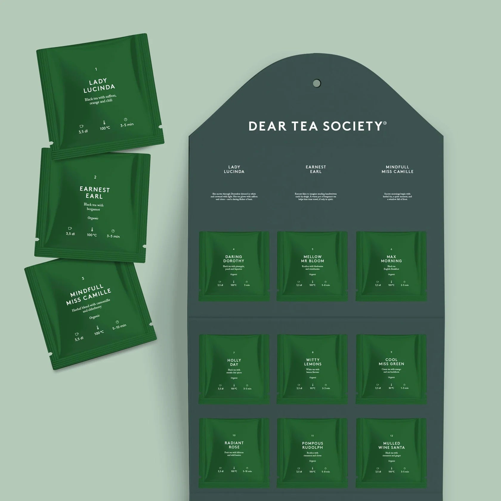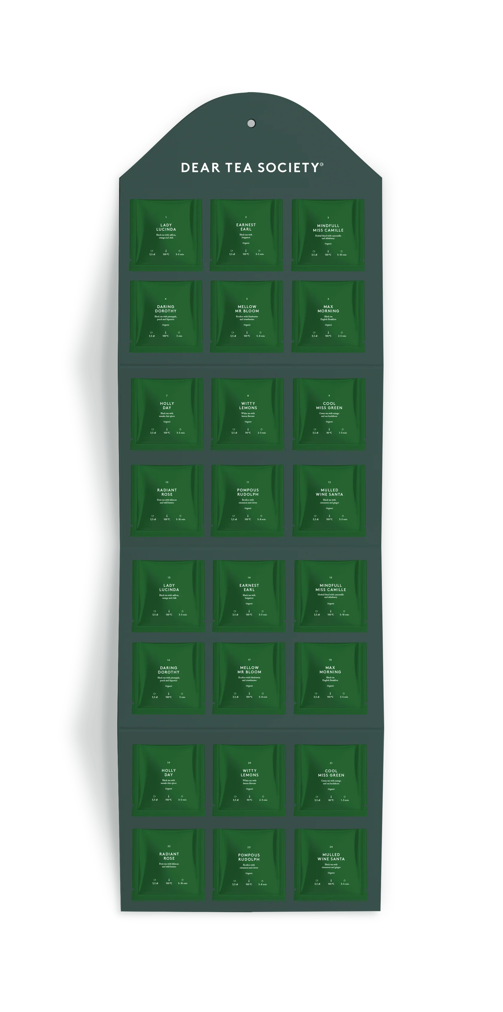 Dear Tea Societyn upea 12 (x2) teelaadun teenmaistelusetti huolella valituista, korkealaatuisista teelaaduista, jotka ovat peräisin maailman tunnetuimmilta teetiloilta. Kymmenen teelaaduista on sertifioitua luomua ja kaksi muuta on valmistettu vastaavalla huolellisuudella ja laadulla, vain ilman virallista luomumerkkiä.