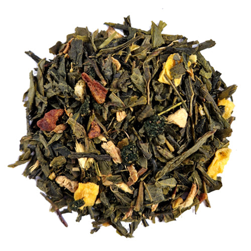 Tällä inkiväärisellä teellä on jekkuisa, hedelmäinen luonne. Passionhedelmällä taitettu mausteisuus on viimeistelty spirulinamuruilla. 70-80°C / 2-3 min