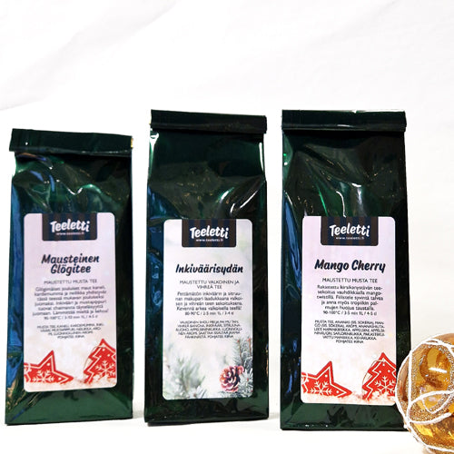 Jouluinen teenystävän kolmen irtoteen setti, josta löydät superjouluisen mustan glögiteen, raikkaan ja keveän inkiväärisen valkoisen teen sekä samettisen kirsikkaisen mustan teen mangotwistillä.