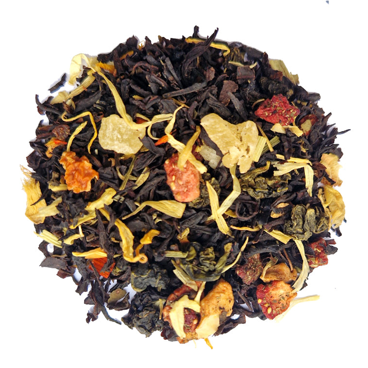 Ainekset: Musta tee, omena, ananas (sis. sokeria ja sitruunahappoa), oolong, sitruuna, karhunvatukanlehti, sitruunaruoho, aromi, luonnollinen aromi, inkivääri, kehäkukka, pakastekuivattu mansikka, valkopippuri, kaktuksenkukka, rosepippuri, santelipuu, saflorinkukka. Saattaa sisältää jäämiä pähkinästä.